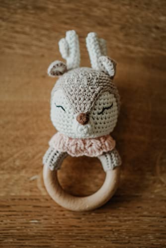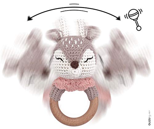 OLGS Beißring gehäkelte Tiere Löwe mit intigrierter Babyrassel, Greifling Spielzeug Beißring Holz | Geschenk zur Geburt…