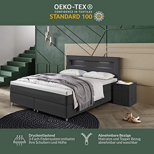 INNOCENT® – P5 LED | Boxspringbett 140×200 in Anthrazit Stoff | 7-Zonen & 3D-Air 6cm | Bonell-Federkernmatratze | H3…