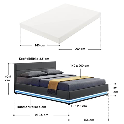 ✅ Traumhafter Schlafplatz — Gemütliches Polsterbett 140×200 cm in Grau mit Matratze, Lattenrost, Kopfteil, LED-Leiste & Bettkasten; für einen gesunden und erholsamen Schlaf nach einem ereignisreichen Tag