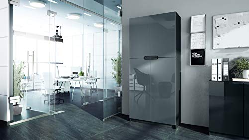 Details: Vladon Büroschrank Logan V1, Aktenschrank mit 5 Fächern und 4 Türen, Schwarz matt/Grau Hochglanz (82 x 185 x 37 cm)
